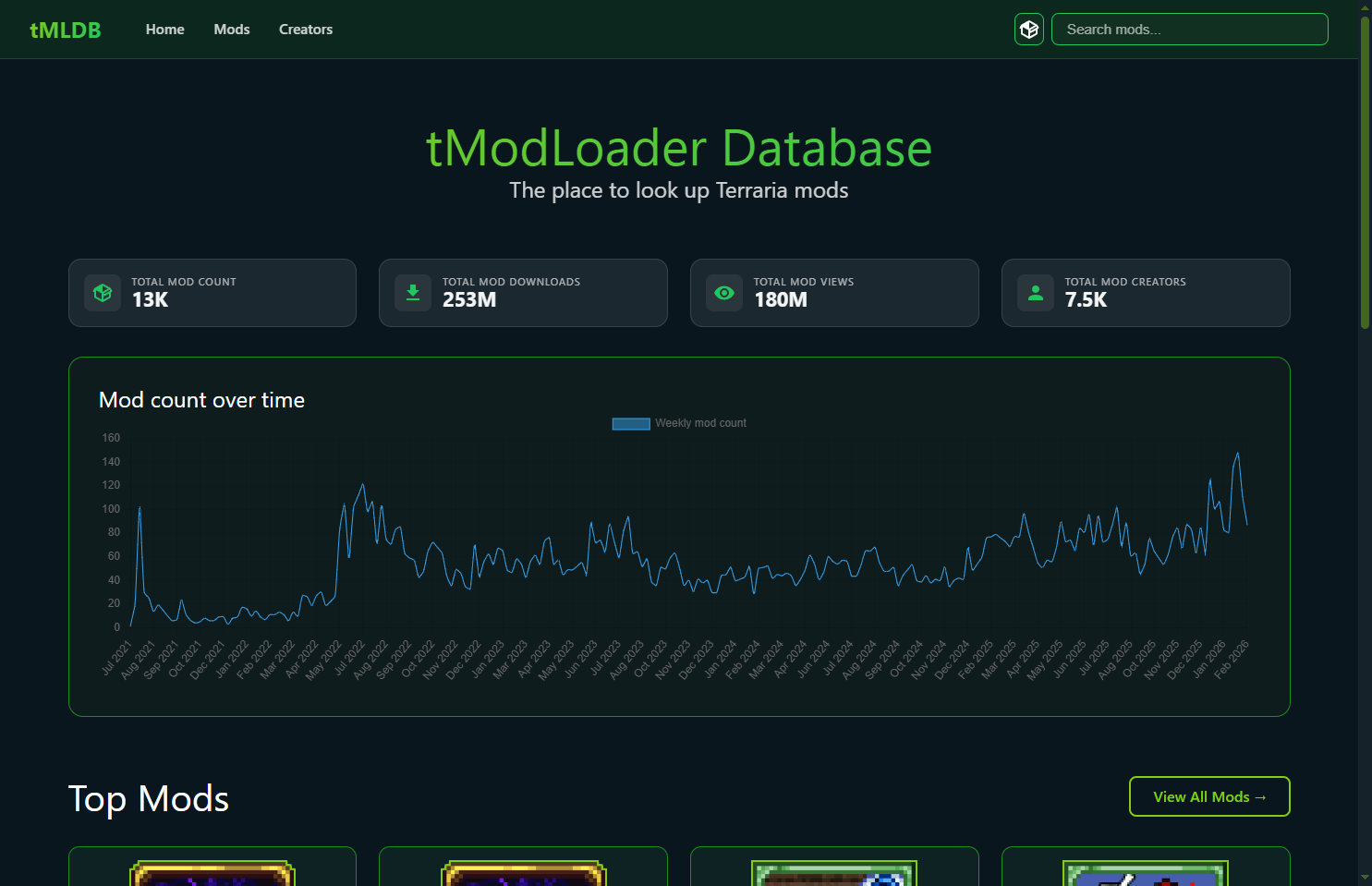 Eine SvelteKit Website mit einem ASP.Net backend, die Statistiken über Terraria Mods anzeigt.